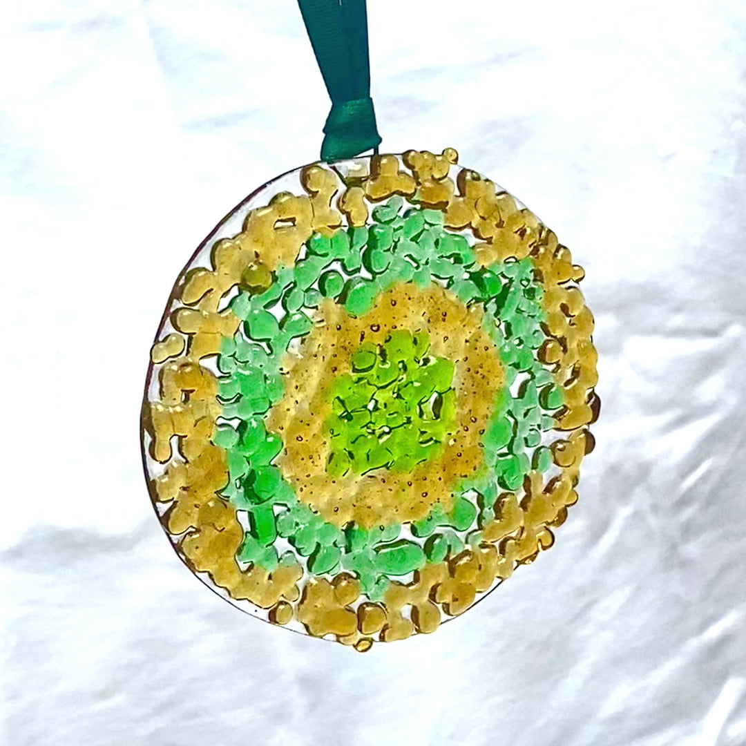 One hand cut and ground 3 1/4" glass circle with melted crushed glass (frit) top in transparent amber and green.