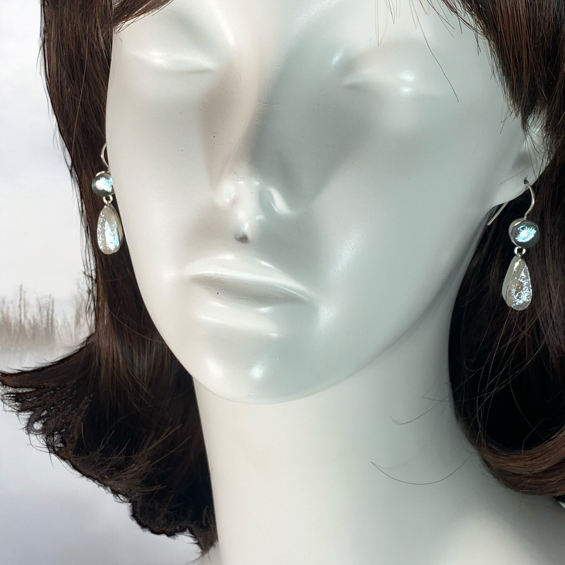 Double drop earrings (3/8" wide x 1 1/4" tall) in platinum gray circles and pearl white teardrops.