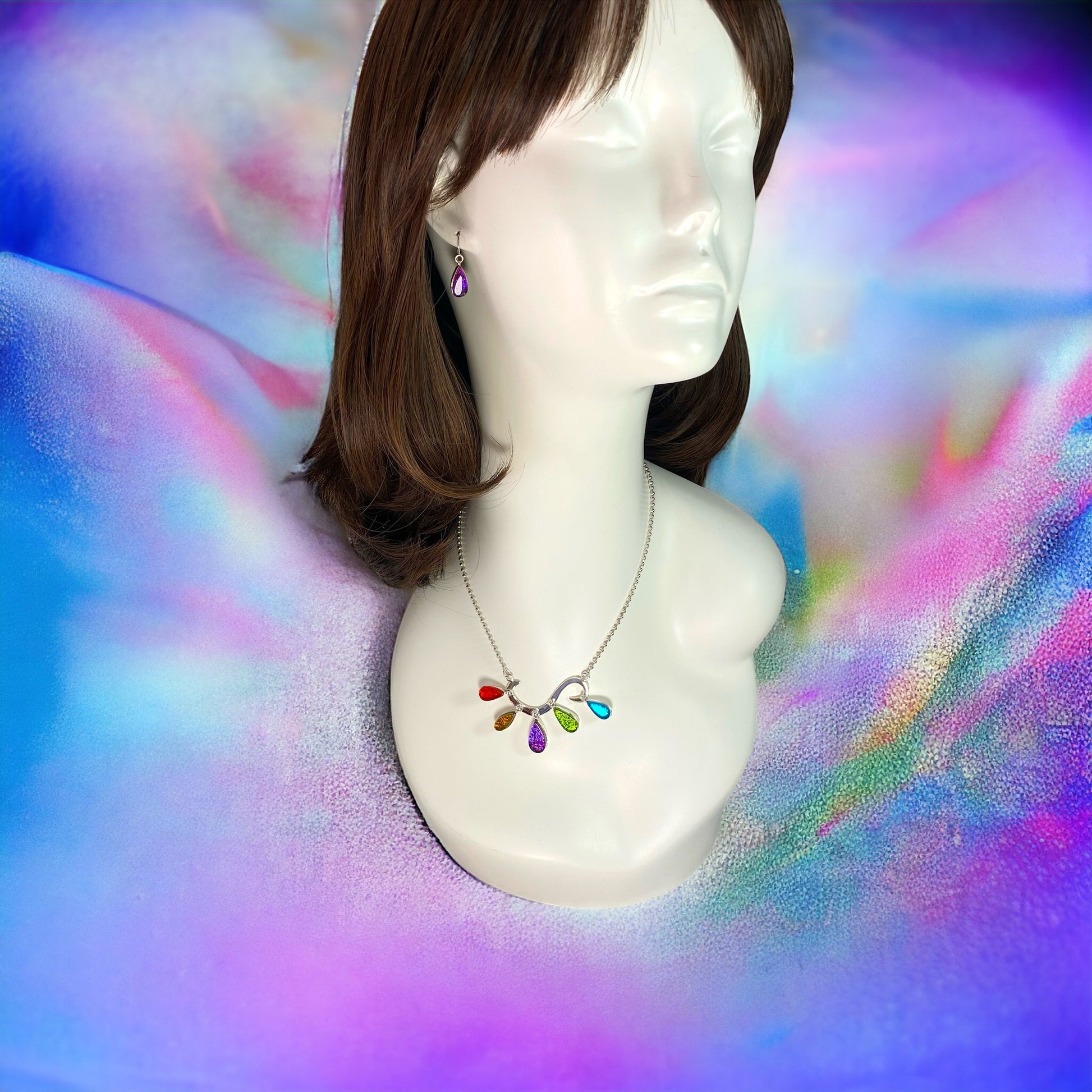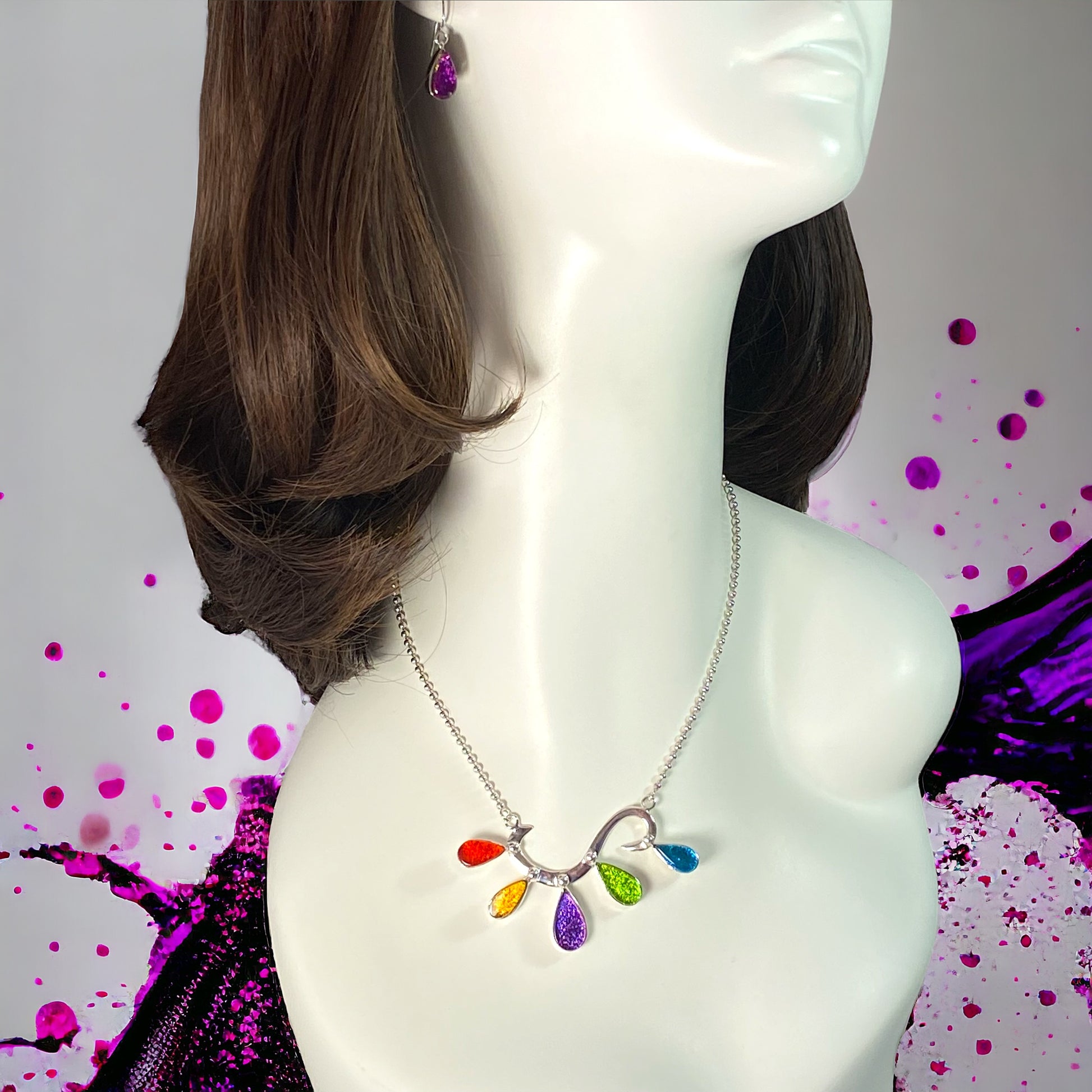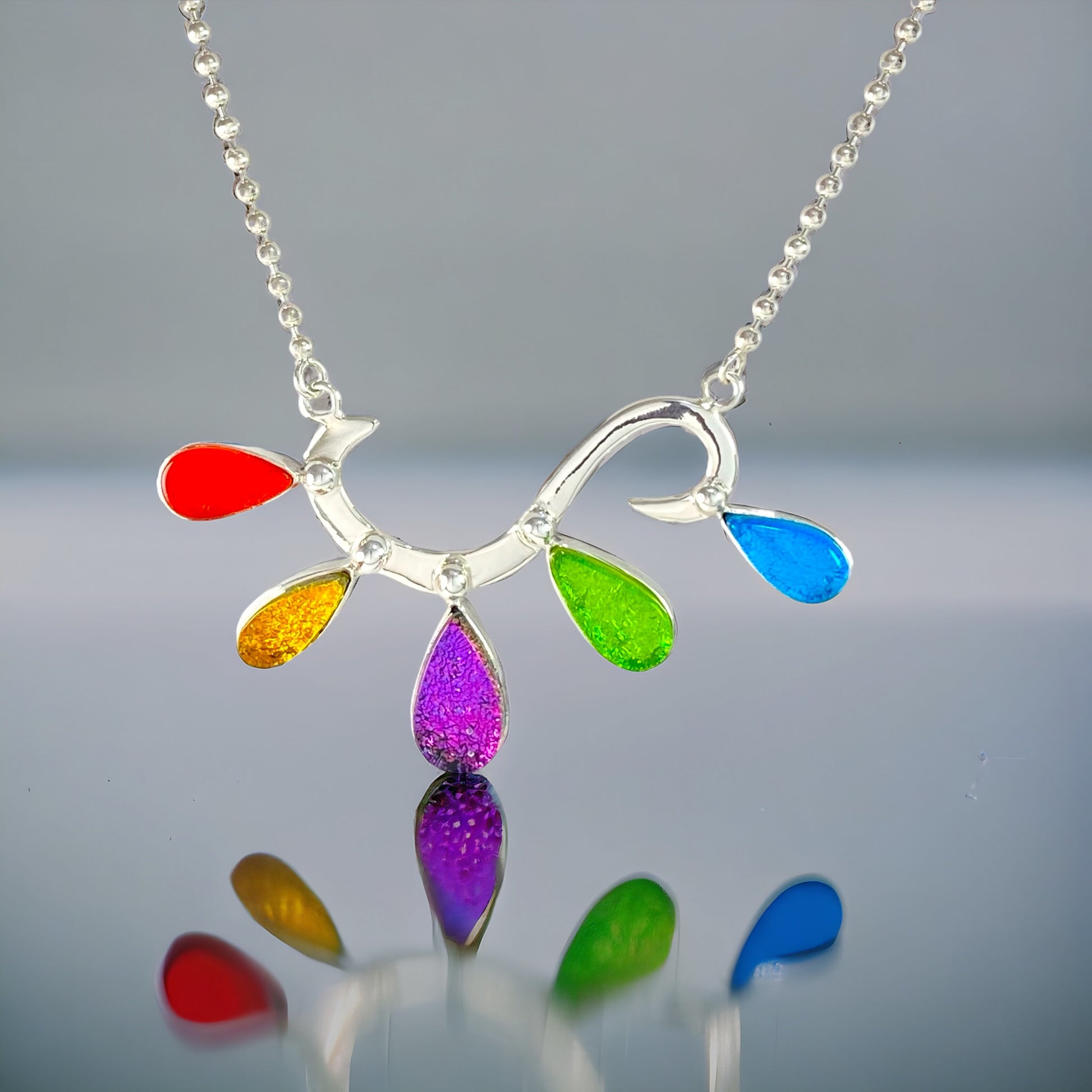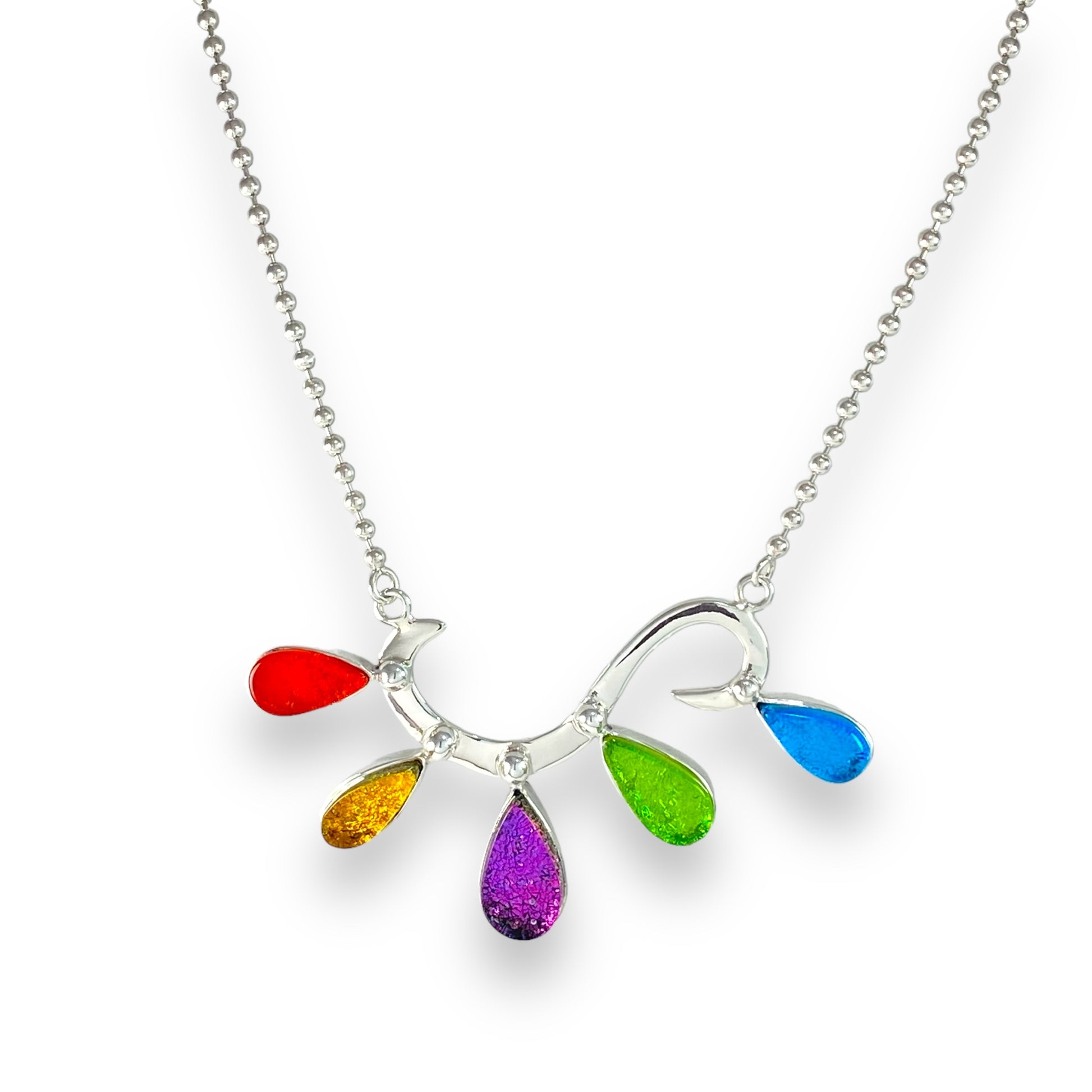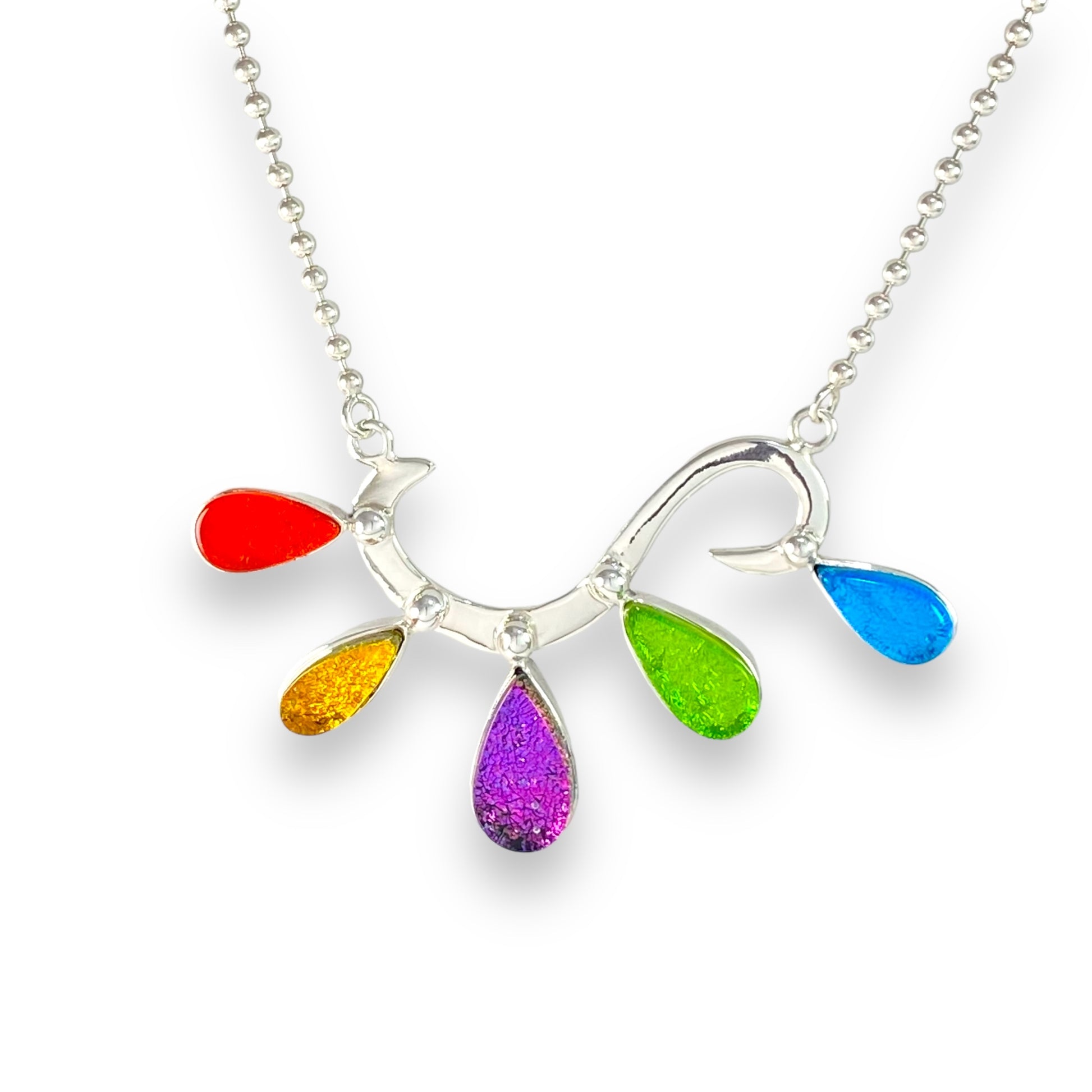 Energy Burst necklace has sangria orange, amber gold, plum purple, citron green and turquoise blue.Necklace is hand forged sterling wire with glass elements set in sterling silver.