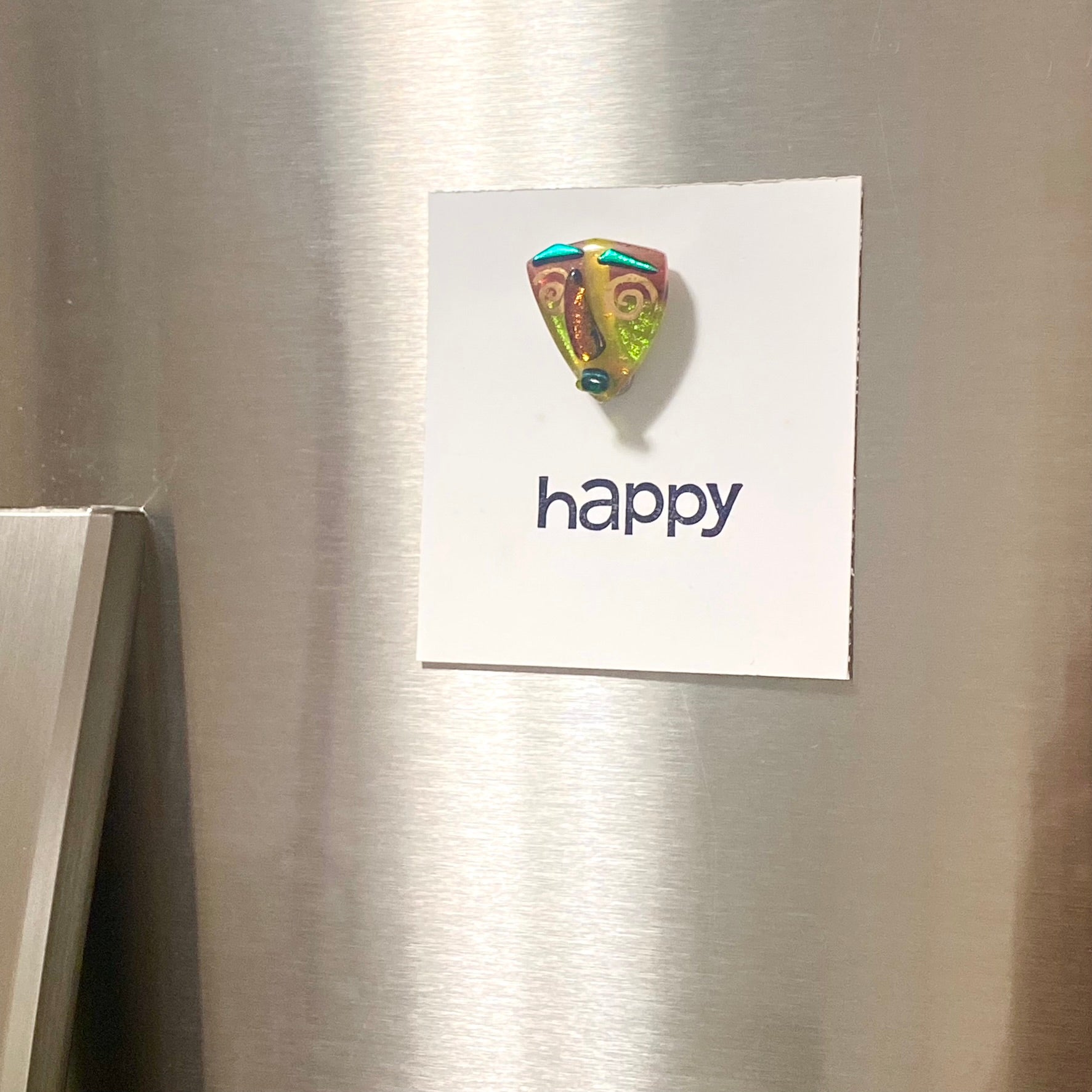 Handmade glass layers of vibrant dichroic colors in greens, yellows and amber with fired on gold luster spiral eyes.