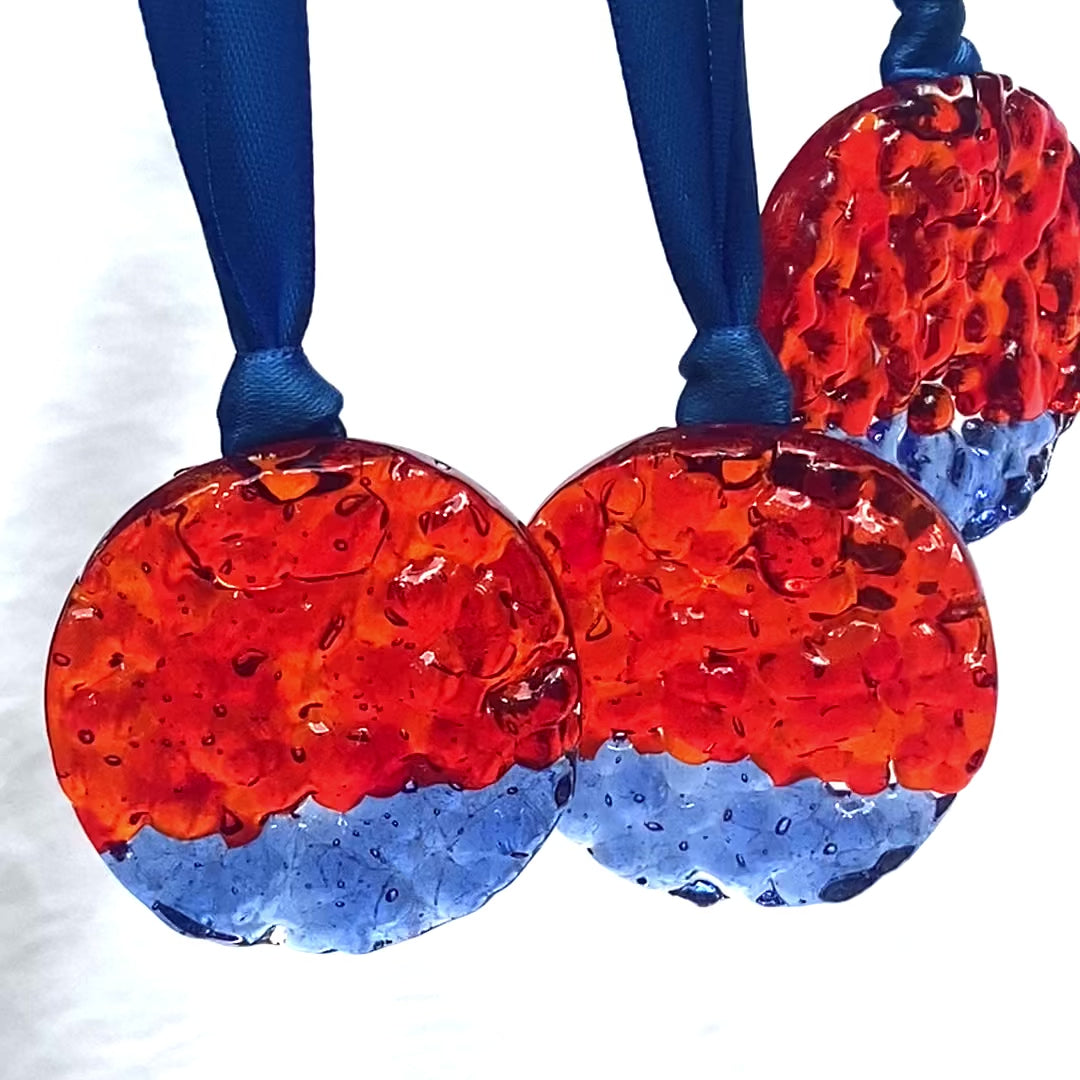 Three (3) Frit Circle Ornaments in Orange and Blue